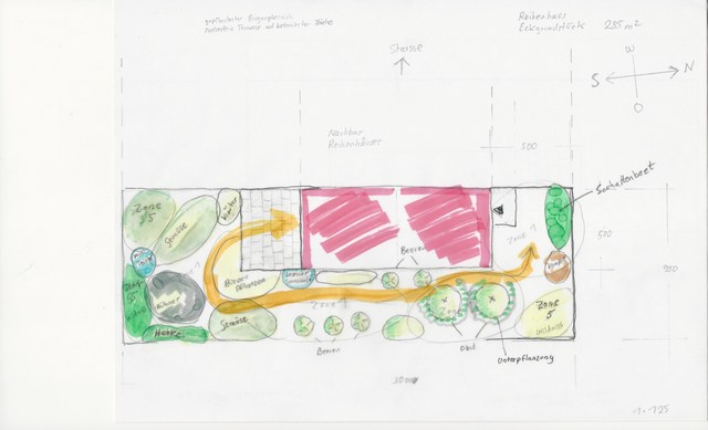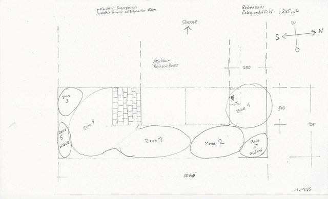 Eine grobe Skizze entwickelt aus den Zonen. Häufig ist es gut dies auf einer Kopie des „Basis Plans“ zu machen oder auf einem Luftbild z.B. aus Google Map.